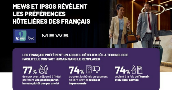 Selon le Sondage Ipsos.Digital pour Mews(1), les voyageurs français confirment leur attachement au contact humain : 77 % préfèrent des services gérés par des équipes en réception plutôt que par l’IA, tandis que 74 % plébiscitent un modèle hybride combinant interaction personnelle et options en libre-service.